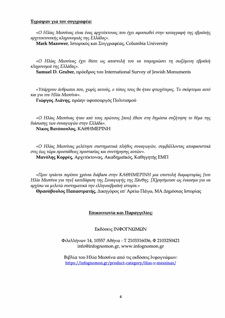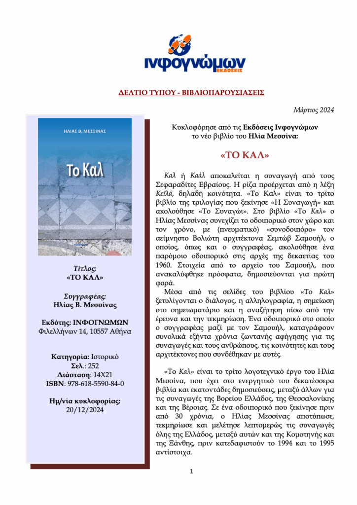 | Καλ ή Καάλ αποκαλείται η συναγωγή από τους Σεφαραδίτες Εβραίους. Η ρίζα προέρχεται από η λέξη Κεϊλά, δηλαδή κοινότητα. «Το Καλ» είναι το τρίτο βιβλίο της τριλογίας που ξεκίνησε «Η Συναγωγή» και ακολούθησε «Το Συναγώι». Στο βιβλίο «Το Καλ» ο Ηλίας Μεσσίνας συνεχίζει το οδοιπορικό στον χώρο και τον χρόνο, με (πνευματικό) «συνοδοιπόρο» τον αείμνηστο Βολιώτη αρχιτέκτονα Σεμτώβ Σαμουήλ, ο οποίος, όπως και ο συγγραφέας, ακολούθησε ένα παρόμοιο οδοιπορικό στις αρχές της δεκαετίας του 1960. Στοιχεία από το αρχείο του Σαμουήλ, που ανακαλύφθηκε πρόσφατα, δημοσιεύονται για πρώτη φορά. Μέσα από τις σελίδες του βιβλίου «Το Καλ» ξετυλίγονται ο διάλογος, η αλληλογραφία, η σημείωση στο σημειωματάριο και η αναζήτηση πίσω από την έρευνα και την τεκμηρίωση. Ένα οδοιπορικό στο οποίο ο συγγραφέας μαζί με τον Σαμουήλ, καταγράφουν συνολικά εξήντα χρόνια ζωντανής αφήγησης για τις συναγωγές και τους ανθρώπους, τις κοινότητες και τους αρχιτέκτονες που συνδέθηκαν με αυτές. «Το Καλ» είναι το τρίτο λογοτεχνικό έργο του Ηλία Μεσσίνα, που έχει στο ενεργητικό του δεκατέσσερα βιβλία και εκατοντάδες δημοσιεύσεις, μεταξύ άλλων για τις συναγωγές της Βορείου Ελλάδος, της Θεσσαλονίκης και της Βέροιας. Σε ένα οδοιπορικό που ξεκίνησε πριν από 30 χρόνια, ο Ηλίας Μεσσίνας αποτύπωσε, τεκμηρίωσε και μελέτησε λεπτομερώς τις συναγωγές όλης της Ελλάδος, μεταξύ αυτών και της Κομοτηνής και της Ξάνθης, πριν κατεδαφιστούν το 1994 και το 1995 αντίστοιχα. |