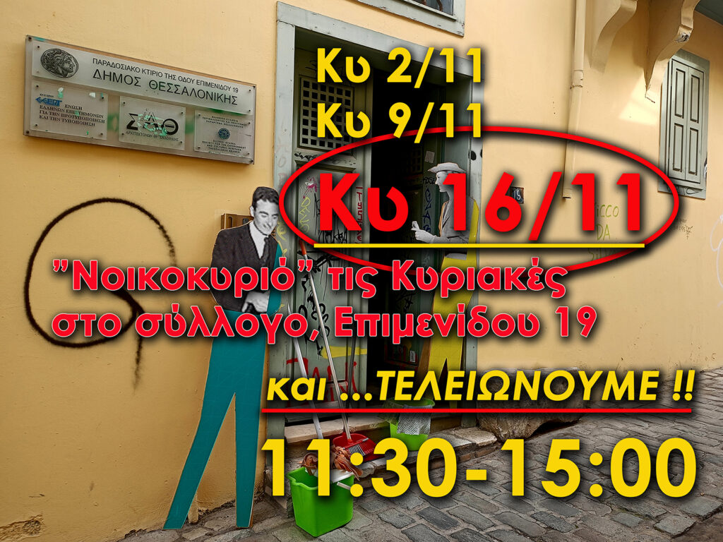 «νοικοκυριό ΤέΛΟΣ» στα γραφεία του Συλλόγου Κυ. 16.11.2025 | 11:30-15:00 @Επιμενίδου 19